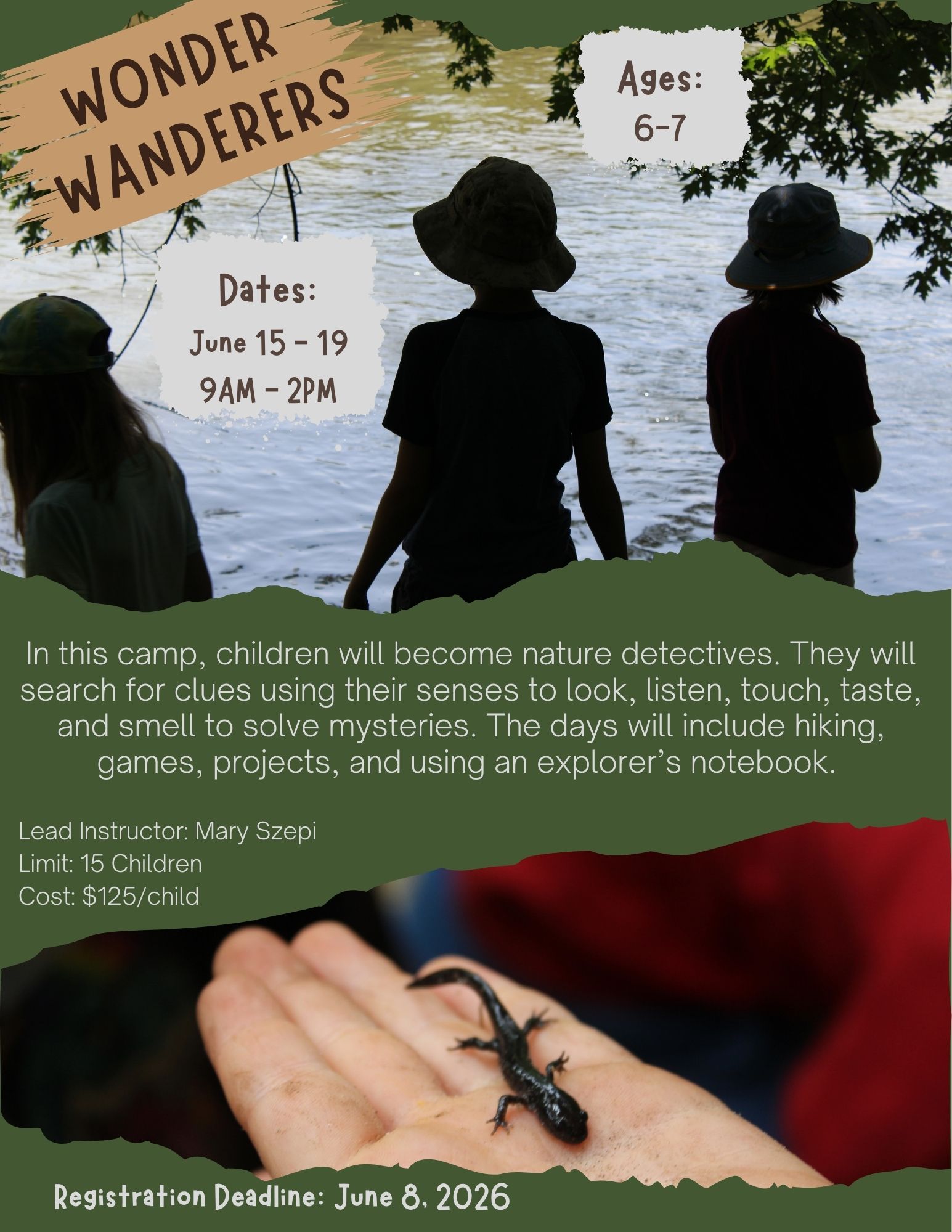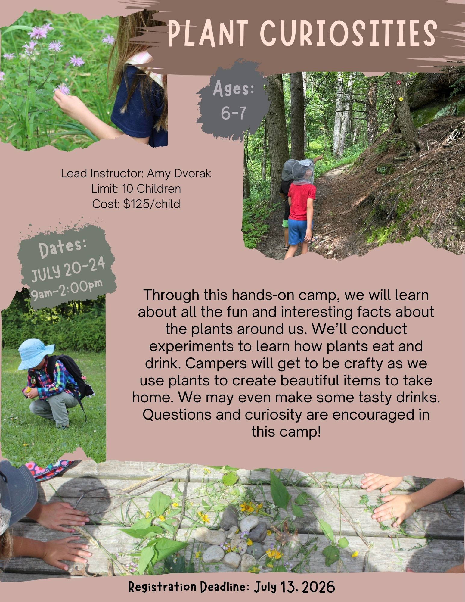 Children will become nature detectives, looking for clues, solving mysteries, and using their senses to look, listen, touch, taste, and smell. Our days will include hikes, games, projects, and an explorer’s notebook. Instructor: Mary Szepi June 15-19, 2026 9:00 am—2:00 pm Fee: $125/camper (includes healthy snack, camper must pack own lunch) Limit: 8 minimum/15 maximum Registration Deadline: June 8, 2026 Ages 6-7: Plant Curiosities