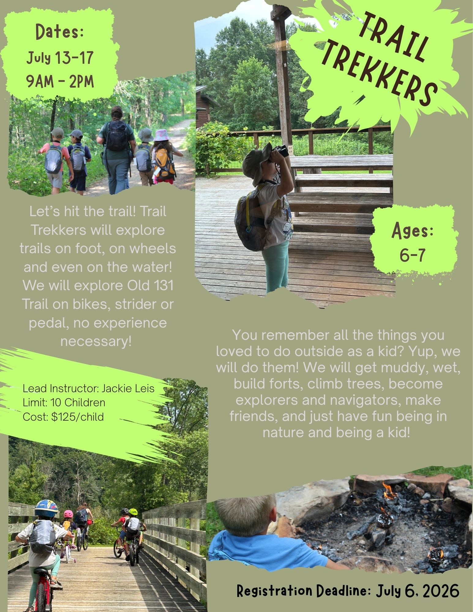 Ages 6-7**: Trail Trekkers Let’s hit the trail! Trail Trekkers will explore trails on foot, on wheels and even on the water! We will explore Old 131 Trail on bikes*, strider or pedal, no experience necessary! Hike our way to a day camp and explore tent camping. Build pint sized boats and rafts and float them down a child friendly stream. All the things you loved to do outside as a kid, yup, we will do them! We will get muddy, wet, build forts, climb trees, become explorers and navigators, make friends, and just have fun being in nature and being a kid!